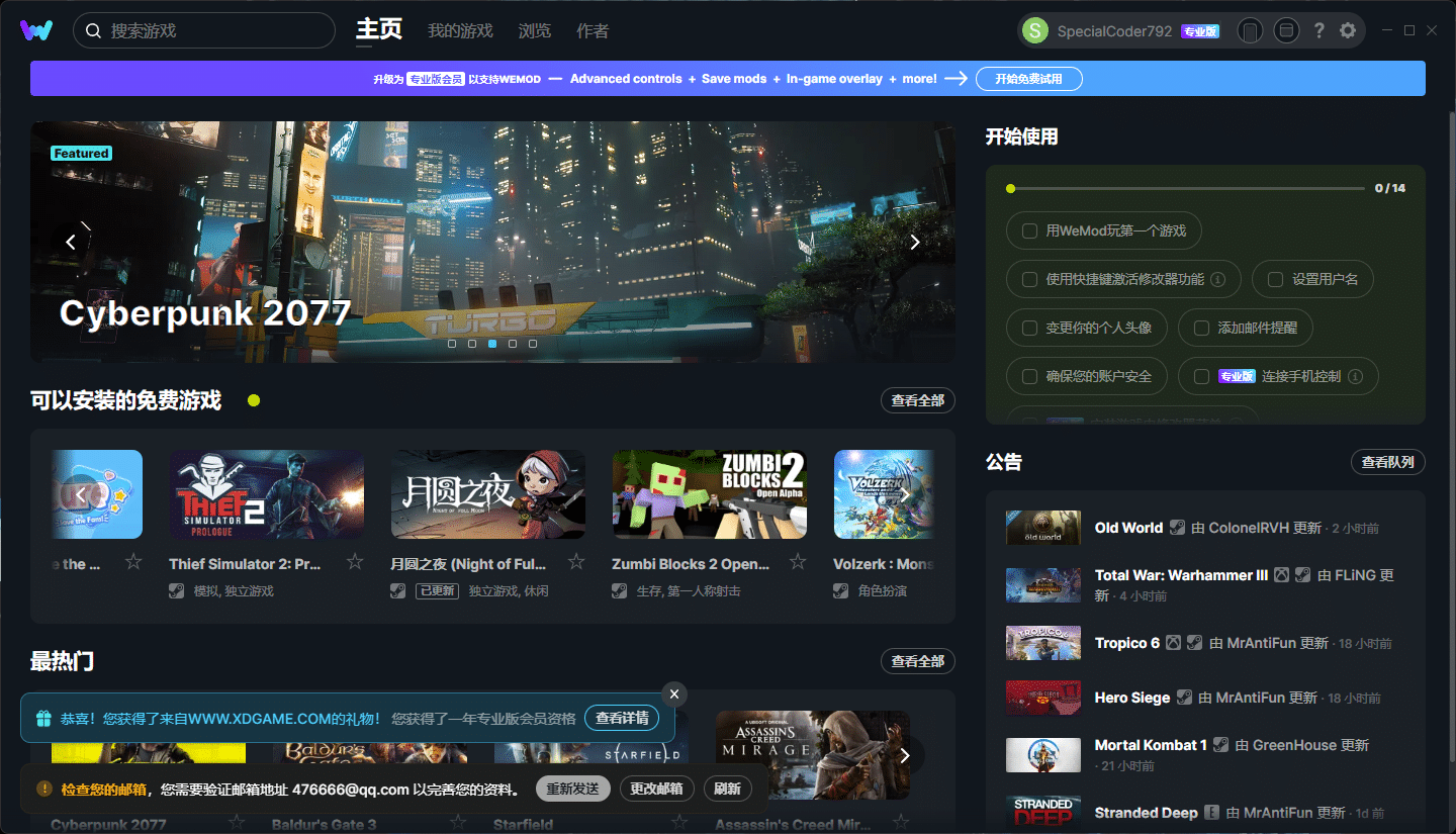 WeMod是国外非常知名的PC游戏辅助工具,在这款软件中可以搜索任何游戏的修改器,MOD等资源。无数作者为各种游戏制作各类辅助工具,支持超过5000款PC单机游戏并且每天都会更新支持更多新的游戏,已解锁专业版会员付费功能!下载即可立即使用。