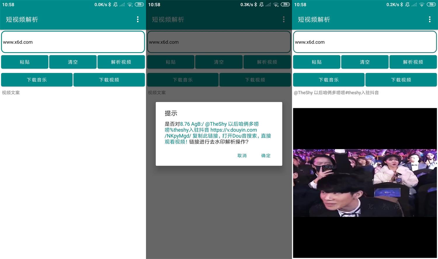 聚合短视频解析去水印工具,支持国内外众多短视频平台,目前支持抖音(暂不支持图集)、抖音极速版、快手、快手极速版、剪映、火山、皮皮虾、皮皮搞笑、最右、微视、QQ看点、西瓜视频、小红书等,进入软件会检测剪切板包含链接会有弹窗,点击确定可快速解析,下载的封面、视频文件会存储在【短视频解析】文件夹下。